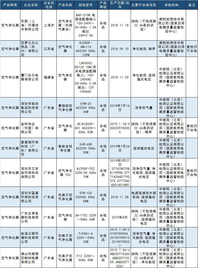 其中,深圳市艾吉森環保科技有限公司生產的空氣凈化器復檢仍不合格。