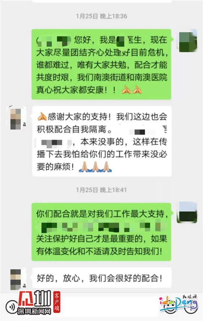 他們就是南澳人民醫院的醫療工作人員。在這次疫情中,市二醫院、新區醫療健康集團聯動,指導南澳人民醫院流動社康醫務人員積極落實大鵬新區關于社區“1+3”工作小組的工作部署,針對這11位武漢同胞的情況,工作人員馬上與他們建立了微信群,在線對他們核實了身份。