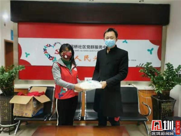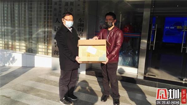 ▲黃志健(右)贈送了500只醫用口罩支援東湖街道防控一線。