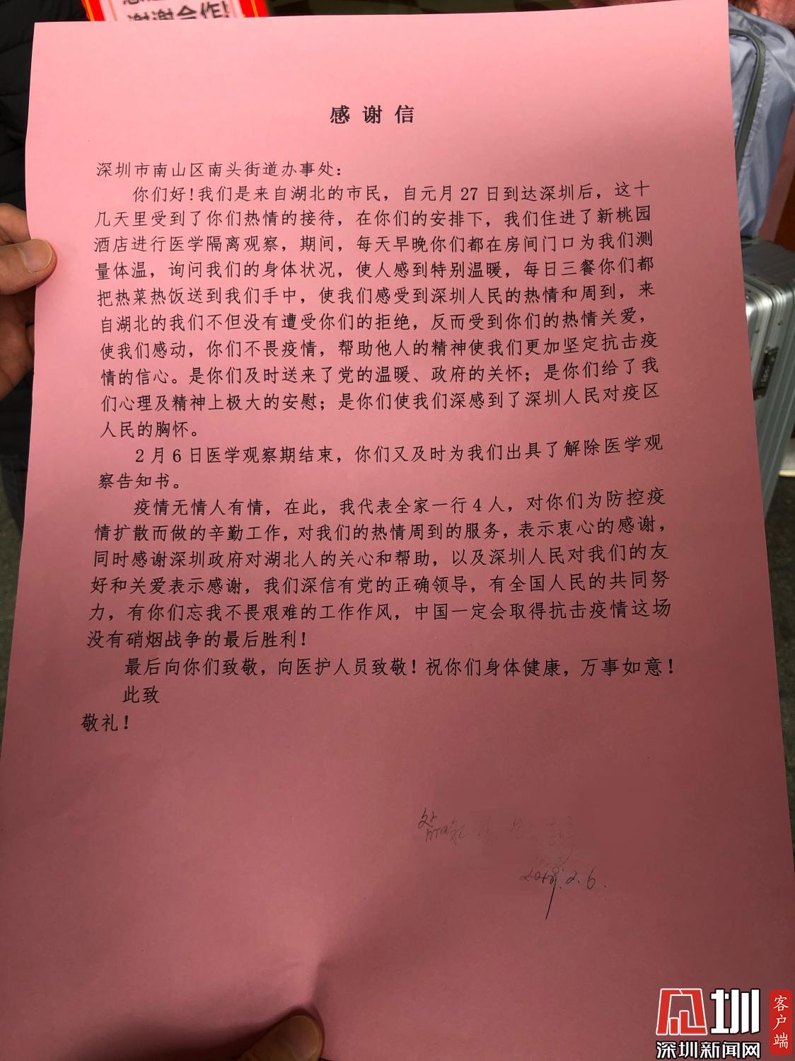 2月6日醫(yī)學(xué)觀察期滿,經(jīng)檢測(cè)他們一家并無不適癥狀,衛(wèi)健局駐點(diǎn)人員為其出具了解除醫(yī)學(xué)觀察告知書。李女士拉著行李滿眼淚花說道:“深圳各級(jí)政府部門高效實(shí)干,深圳的工作人員很熱心很細(xì)心,疫情猖獗時(shí),人間自有真情在,真的感謝你們。”