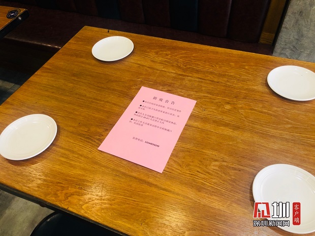 餐廳在門口處配備體溫測試儀,隨時(shí)對進(jìn)入餐廳的人員進(jìn)行體溫監(jiān)測。在人員疫情防控方面,小芙蓉餐廳的員工都是留深人員為主,要求員工每天在晨檢時(shí)測量體溫及進(jìn)行手部消毒后方能上崗,每天測量體溫2次、更換口罩2次;在顧客進(jìn)來餐廳用餐前先要求其要在門口處測量體溫,之后要對鞋子進(jìn)行消毒后方可進(jìn)店;當(dāng)外賣小哥過來餐廳取餐時(shí)則要求其在門口等候取餐,并為其測量體溫。此外,餐廳還在每張桌子上貼有防疫公告,以提醒進(jìn)店用餐的顧客注意自身防護(hù)。
