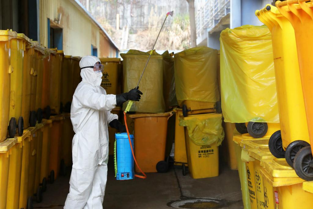 ▲卸完醫療廢物后,工作人員對堆放區域進行消毒。