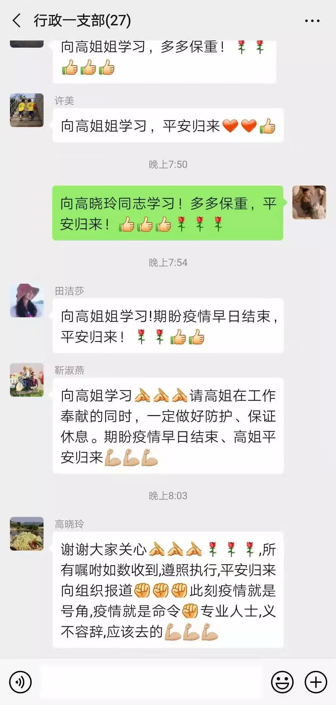 晚上,在黨支部的微信群里,作為支部委員的高曉玲向組織堅定承諾:“此刻疫情就是號角,疫情就是命令,專業人士,義不容辭,應該去的!”