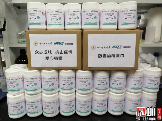 據悉,首批捐贈的護目鏡防霧酒精濕巾數量為6000張(100桶)。該濕巾由孫大陟和南科大首屆畢業生張至共同發起創立的深圳南科新材科技有限公司和孫大陟課題組共同緊急研發趕制,簡單擦拭后可保證護目鏡鏡片長時間不起霧,對人體人眼無毒無害,且能起到有效消殺病菌作用。每片濕巾可至少擦拭一副護目鏡,防霧效果可至少持續一天,大大節省了醫護人員清潔裝備的時間,為爭分奪秒抗擊疫情提供了有利條件。