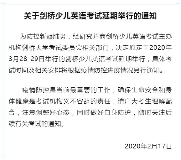 為貫徹落實國家和我省對新型冠狀病毒感染的肺炎疫情防控有關工作的部署和要求,切實保障廣大考生和考試工作人員生命安全和身體健康,經研究決定,推遲原定于3月7-8日舉行的普通高考英語聽說考試和本科插班生考試(含三二分段專升本轉段考試)。具體時間安排視疫情控制情況另行通知。