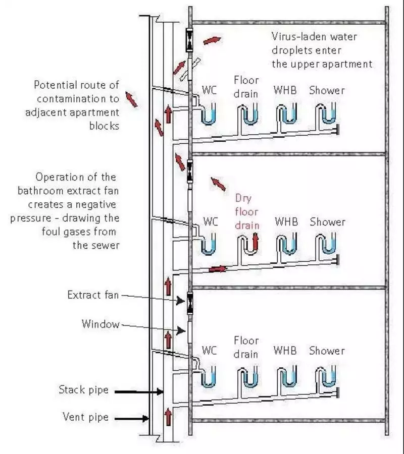 由于干涸的U型管內存在帶病毒的污染物,而這些污染物處于暴露狀態,可能通過地漏、甚至排風扇循環等其中的污染顆粒被人吸入導致感染。