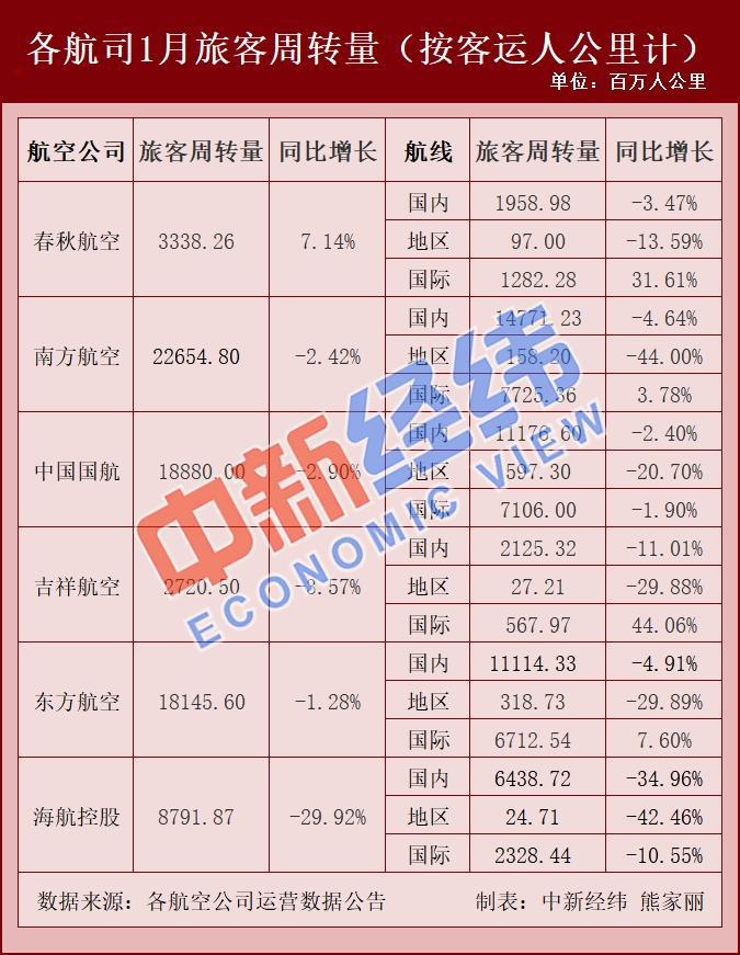 統計發現,春秋航空、南方航空、吉祥航空等6家航空公司已公布2020年1月運營數據。從旅客周轉量 (按客運人公里計 )來看,與去年同期相比,1月僅春秋航空一家上漲,增7.14%,其余5家均同比下降。