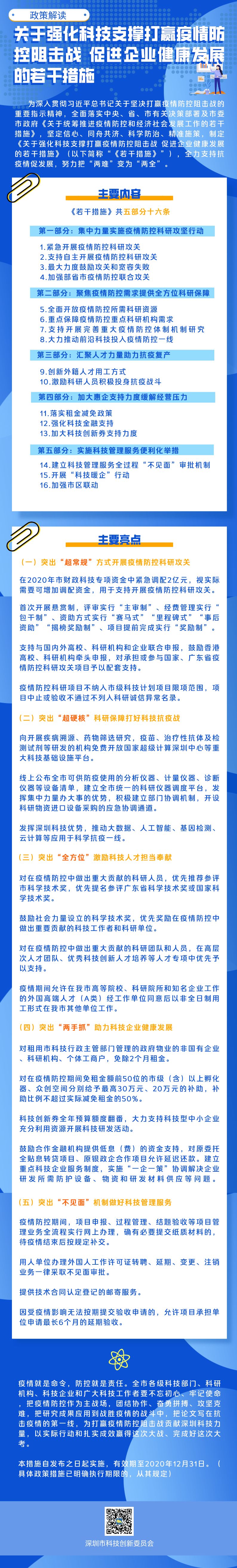 (二)支持自主開展疫情防控科研攻關。支持深圳灣實驗室、鵬城實驗室等高水平科研機構將疫情防控作為當前科研攻關的重要方向,其自主設立的應急防控科研項目擇優視同承擔市級科技計劃項目。對在疫情防控中發揮重要作用的單位優先支持申建市重點實驗室等市級創新載體、優先推薦申建國家、省重點實驗室等國家級或省級重大創新平臺。