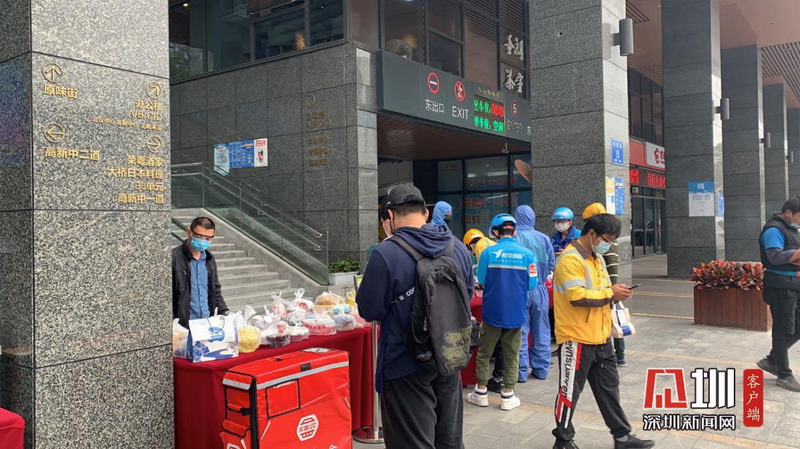 科興科學園整個園區分為東、西、南、北四個入口,外賣人員只能夠將餐品放置在取餐點,園區有專門的工作人員身著防護服對送餐人員進行體溫檢測和防止人員聚集。
