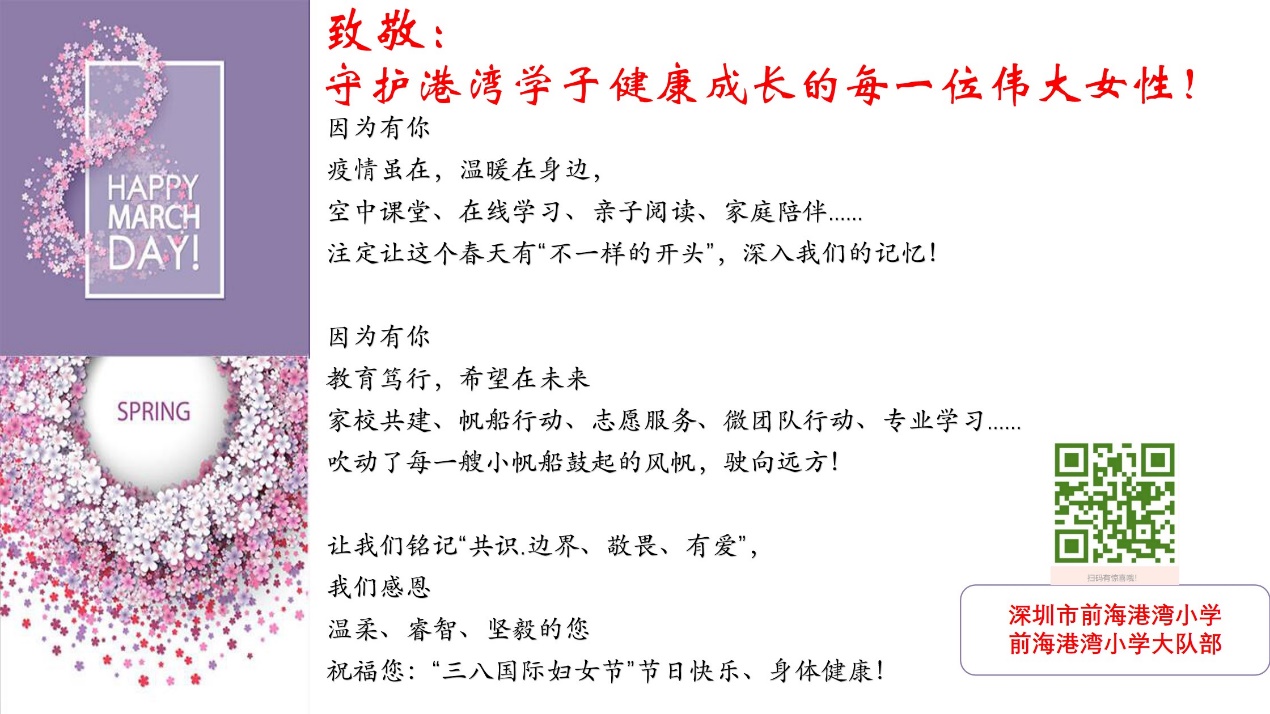 3月8日,“國際婦女節”,在這個特殊的節日里,前海港灣小學又是怎樣給“女神們”過節,學校又送了哪些溫馨的祝福,一起來看一看: