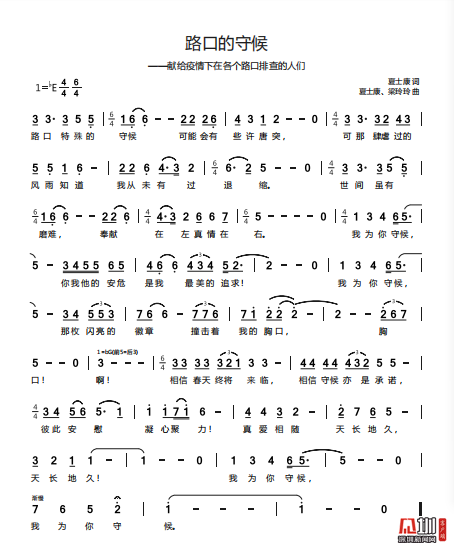 近日,龍崗區文化廣電旅游體育局職工夏士康、梁玲玲聯合北京自由音樂人劉珂銘創作的歌曲《路口的守候》正式推出。“路口,特殊的守候,可能會有些唐突,可那肆虐過的風雨知道,我從未有過退縮……”該歌曲以抗疫一線實錄為背景,深情表達了對以“路口戰士”為代表的抗疫戰士們的敬愛之情,及眾志成城、抗疫必勝的堅定信念。
