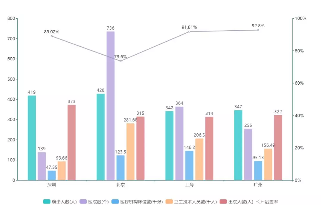 ▲對比北京、上海、廣州等城市,深圳的醫院數、床位數及衛生技術人員數量都處在第四位,醫療資源現有儲備略顯不足,勢必給疫情防控過程中的患者救治工作帶來嚴峻考驗。