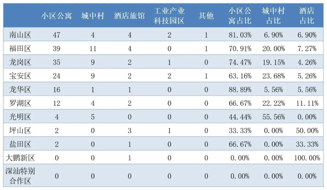 ▲福田、龍崗、寶安城中村病例較多。大鵬新區病例均在酒店旅館停留,為輸入型病例。