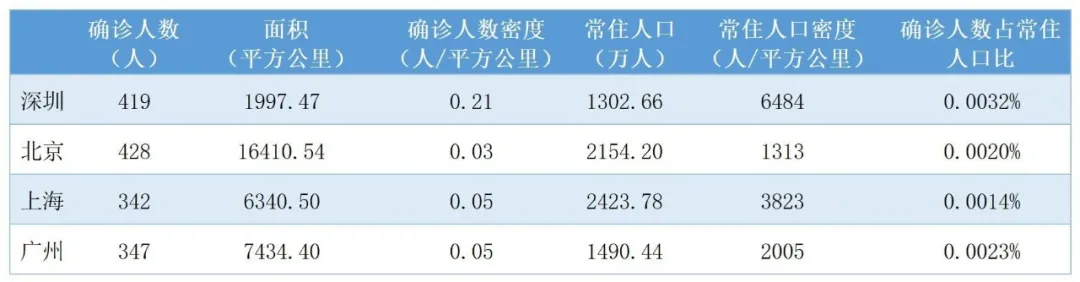 ▲深圳常住人口密度大,人員流動頻繁,疫情防控難度高,導致確診人數在北、上、廣、深四大城市中最多,分布密度位也居首位,對防控工作形成巨大壓力。