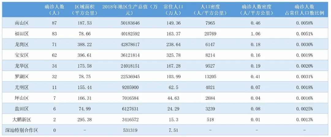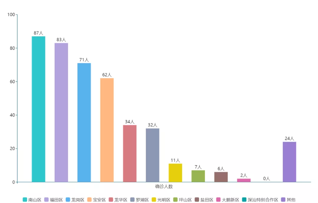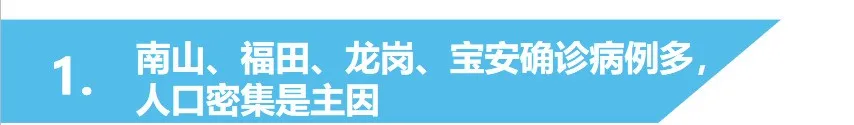 ▲按照區域劃分,已公布的確診病例中,南山區87例、福田區83例、龍崗區71例、寶安區62例,為患者較多的幾個區,與其人口較多、經濟發達有關。深汕特別合作區暫未出現病例。