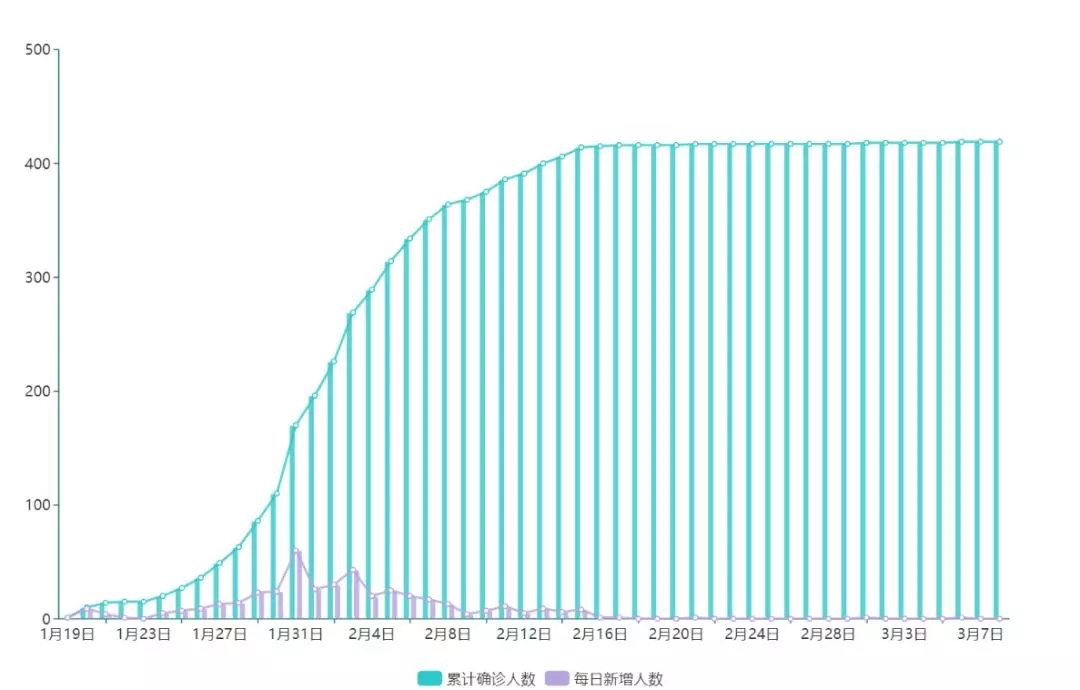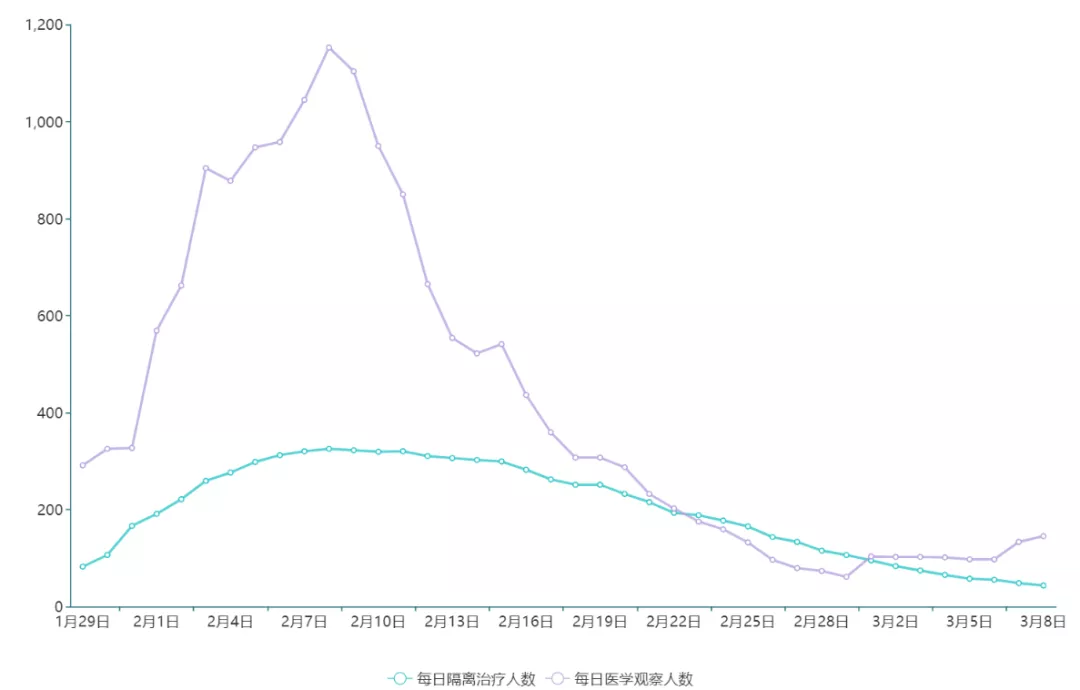 ▲2月7日起,每日新增確診病例數保持在較低水平。2月18日至3月5日,深圳僅新增兩例(均為境外輸入型病例)。這一方面是由于國內疫情發生地采取封閉措施后,輸入型病例不斷減少;另一方面基層疫情防控工作取得較好成效,病毒本地傳播被有效阻斷。