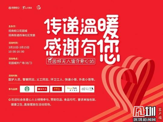 見圳客戶端·深圳新聞網訊(記者 王志明)他們奔波勞累,保障我們生活的秩序與安全他們勇敢逆行盡力守護城市的正常運轉:醫護人員、警察同志、社區工作人員、義工同志、環衛工人、快遞小哥、外賣小哥……今天的招商街道,多了一道靚麗的風景線。 為了向這群最可愛的人表達我們的感恩、感動,招商街道四海社區黨委攜手招商蛇口花園城,共同開啟“無人值守愛心站”公益活動,每天提供上千份愛心食品免費領取,感謝在這座城市里那些不斷奔波守護著大家生活的平凡英雄們。 活動時間:3月10日至3月15日 活動地點:花園城外廣場 活動對象:醫護人員、警察同志、社區工作人員、 義工同志、環衛工人、快遞小哥、外賣小哥等 除了星巴克、面包新語、面點王、許留山、醒牧等商家熱心公益傾情參與此次公益活動,花園城的許多員工也自發的采購起來,抱著一份份愛與尊敬時刻補貨,用自己微小的力量幫助著逆行者們。 花園城無人值守愛心站活動時間為3月10日至15日,持續6天,歡迎社會愛心人士傾情參與食品贊助,所提供物品采用單獨包裝、健康衛生,直接擺放在活動現場即可。 春暖花開,山河無恙,人間皆安。待疫情結束,我們定會溫暖相遇在這座鮮花簇擁的城市里。
