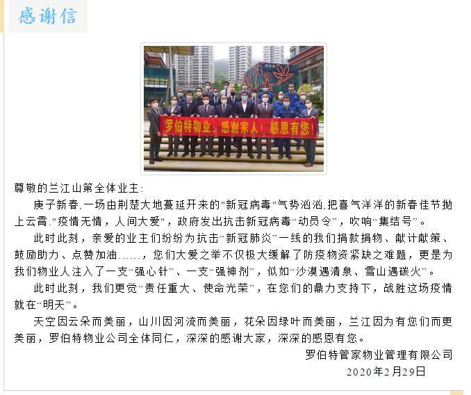 近日, 梅林街道多個小區的業主在業主群里感謝物業工作人員在特殊時期的忠于職守、辛勤付出,獲得其他業主的高度認同,紛紛說,“我們的物業很贊!”“物業人員辛苦了!”。