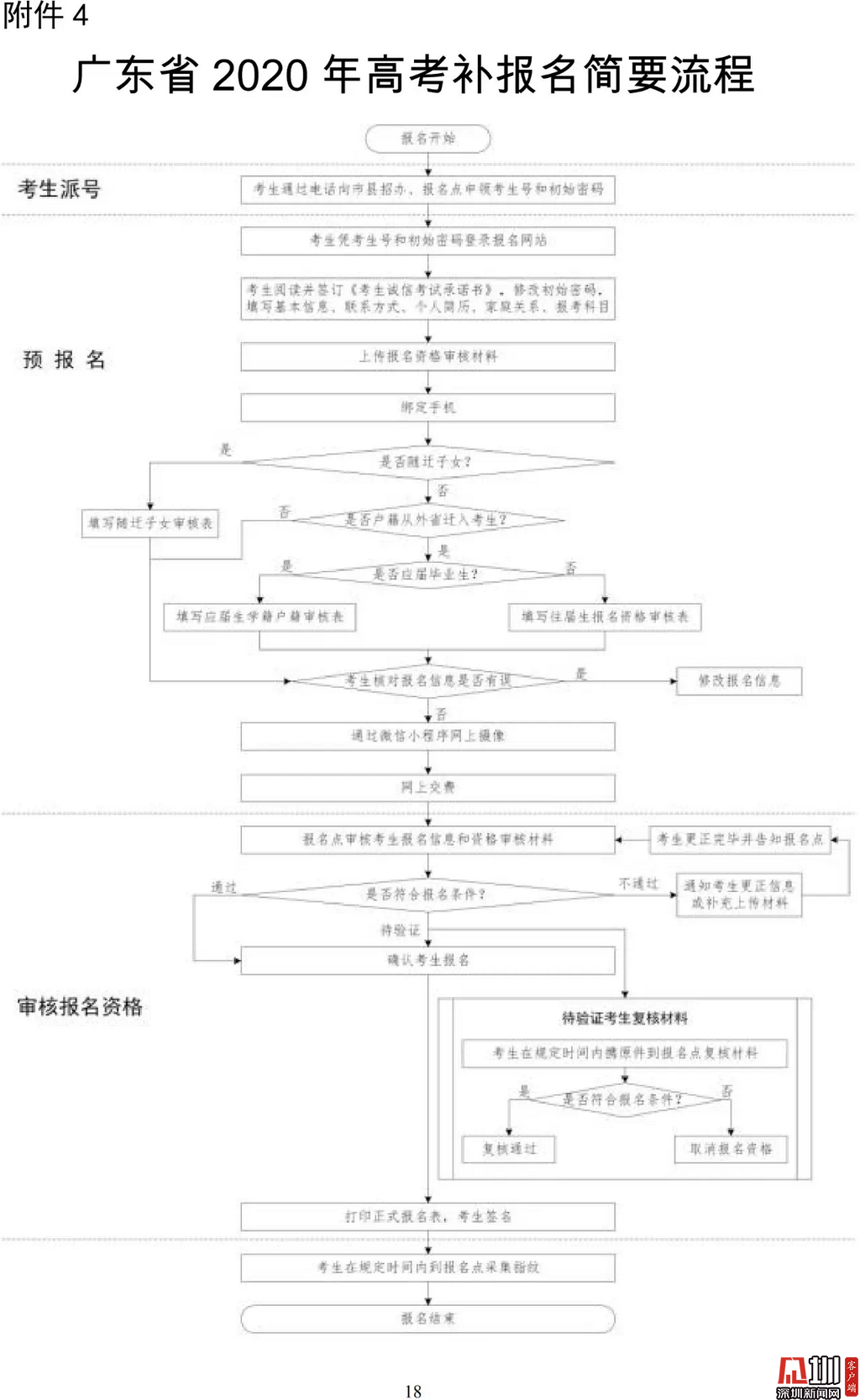 見圳客戶端·深圳新聞網2020年3月19日訊(見圳客戶端、深圳新聞網記者 金洪竹)3月18日,記者從廣東省招生委員會辦公室獲悉,為滿足退伍軍人、運動訓練及武術與民族傳統體育考生、高職院校自主招生考生等符合我省高考條件,因各種原因尚未參加高考報名人員的需求,經研究決定安排一次高考補報名,補報名時間為3月23-26日。同時,為確保考生和考試工作人員的生命安全和身體健康,減少聚集,本次高考補報名采取先線上辦理、后補驗材料的方式進行。