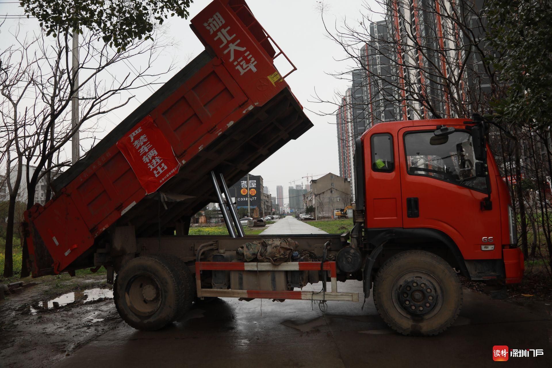 2月26日,監利,用于隔斷交通的大貨車。