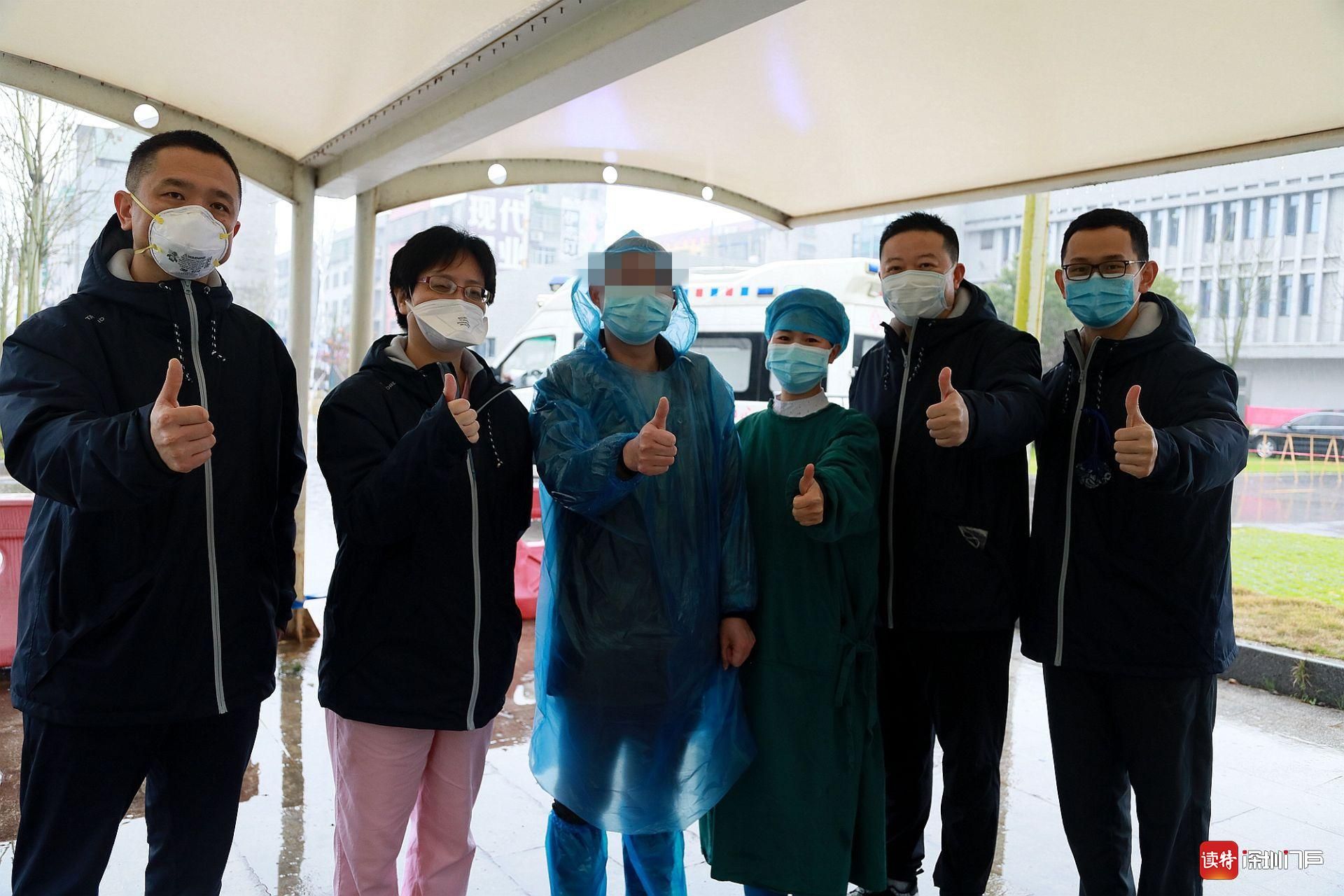 3月8日,監利縣首例新冠肺炎重癥患者張建(化名,中)治愈出院后與深圳醫療隊醫護人員合影留念。