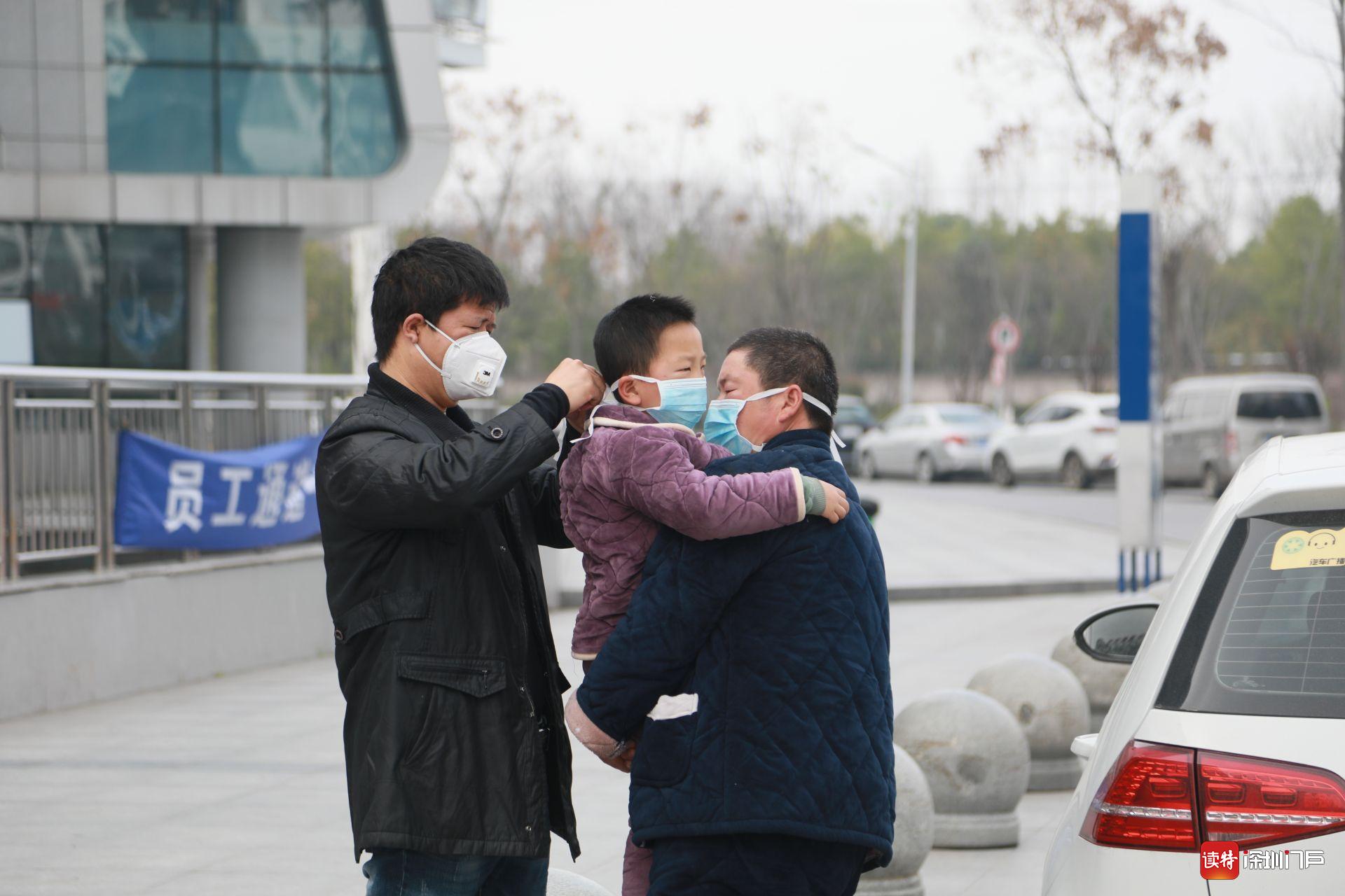 2月19日,監利,一位父親幫助年幼的孩子戴口罩。