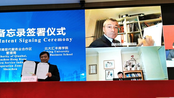與以往不同,本次簽約儀式采用了現場簽約與視頻連線“云簽約”結合的特殊方式。前海管理局與中鐵建資本控股集團有限公司,與國研科工、彩虹魚,與北京大學匯豐商學院、劍橋大學嘉治商學院的合作采用了“云簽約”。