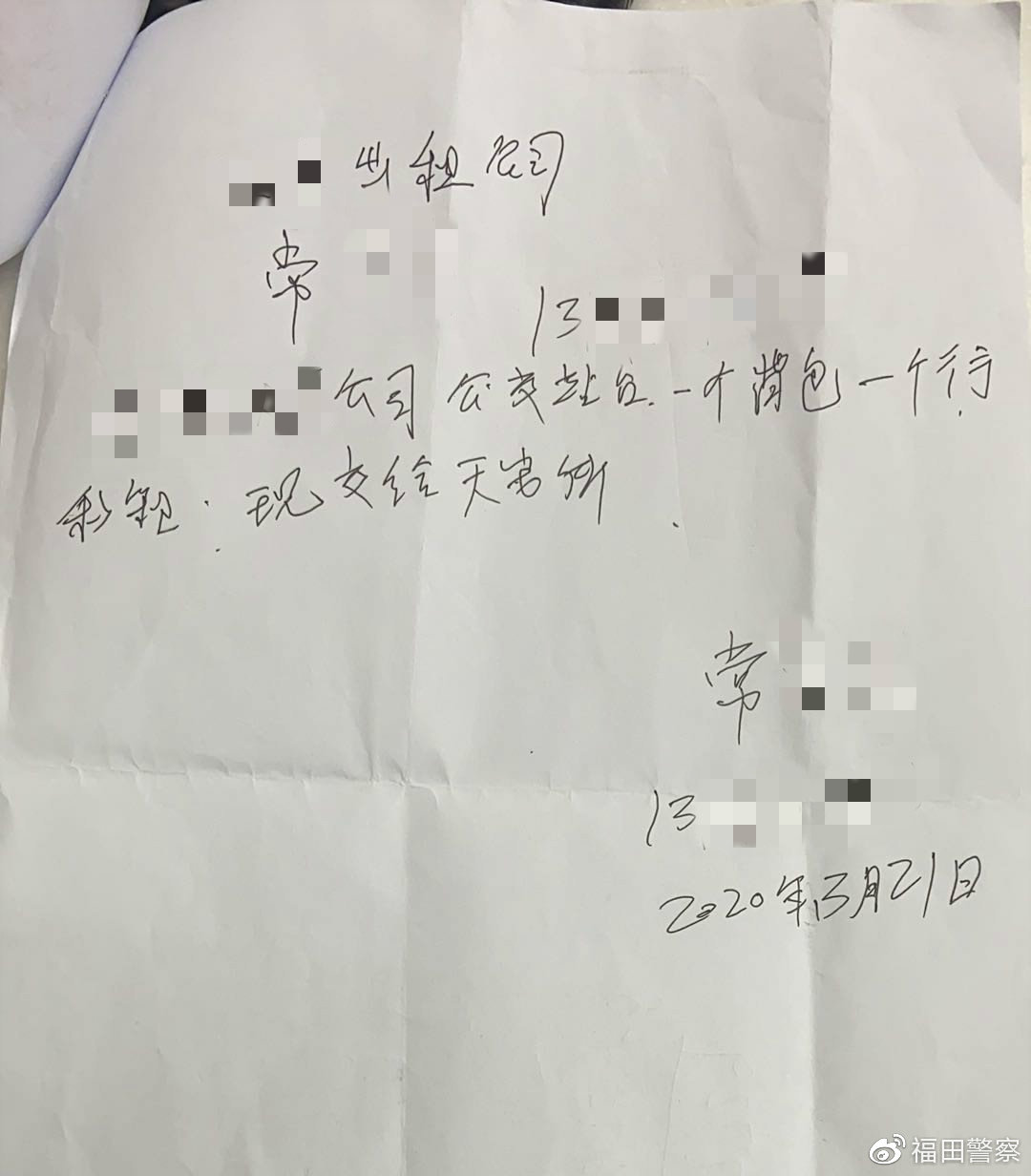 3月21日晚,一輛的士開到深圳市公安局福田分局天安派出所門口,的士司機(jī)從車上拿下來(lái)一個(gè)黑色的背包和銀色的行李箱到前臺(tái)。