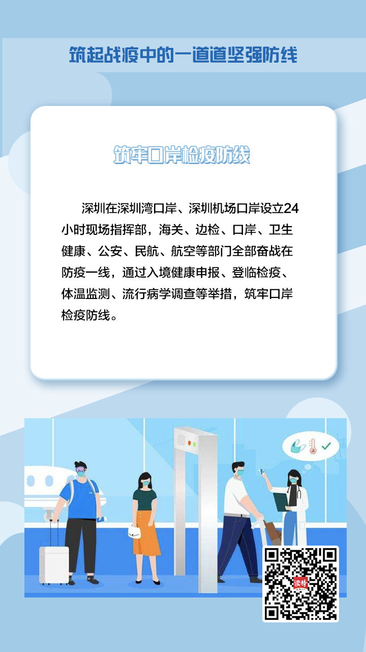深圳在深圳灣口岸、深圳機場口岸設立24小時現場指揮部,海關、邊檢、口岸、衛生健康、公安、民航、航空等部門全部奮戰在防疫一線,通過入境健康申報、登臨檢疫、體溫監測、流行病學調查等舉措,筑牢口岸檢疫防線。