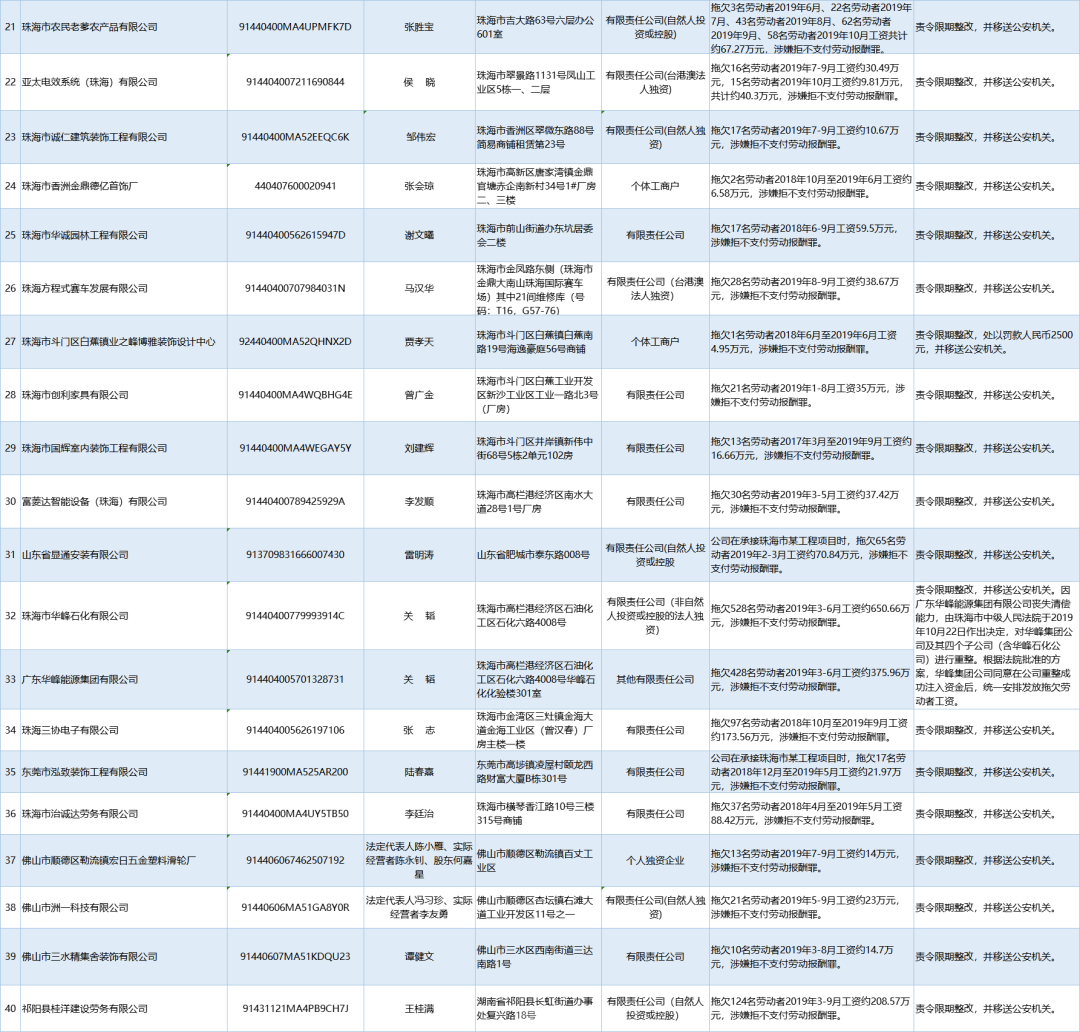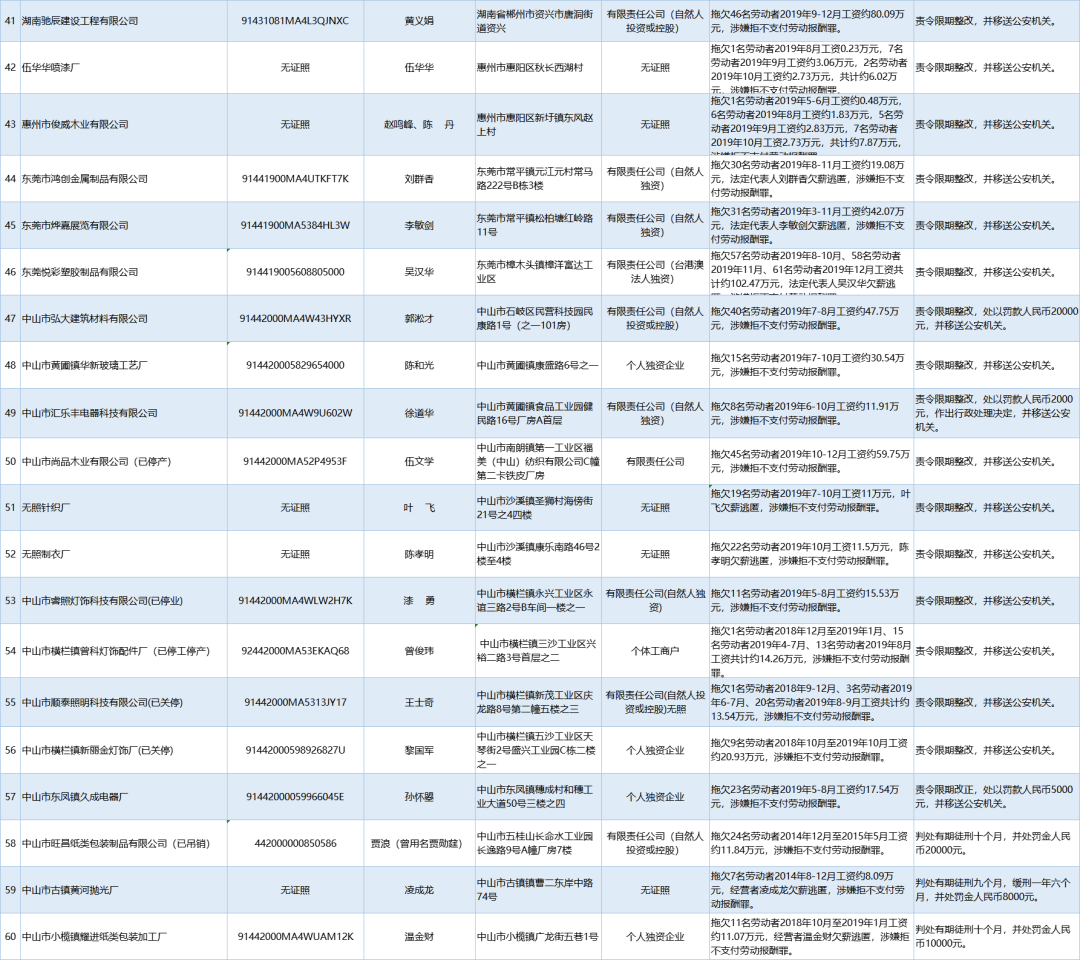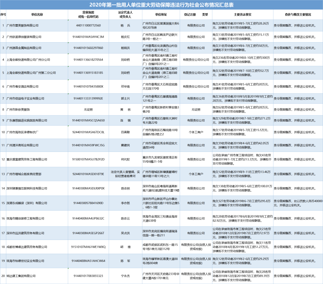 為加強對違法用人單位的社會監督,強化誠信體系建設,加大威懾力,依據《廣東省用人單位重大勞動保障違法行為社會公布暫行規定》,省人社廳公布2020年第一批重大違法案件,涉及81家企業,其中深圳豬兼強互聯網科技有限公司拖欠138名勞動者2019年5-6月工資約100.01萬元,涉嫌拒不支付勞動報酬罪,被責令限期整改,并移送公安機關。深港東成睡袋(深圳)有限公司拖欠327名勞動者2019年6-7月工資約295.8萬元,涉嫌拒不支付勞動報酬罪,被責令限期整改,處以罰款人民幣4萬元,并移送公安機關。