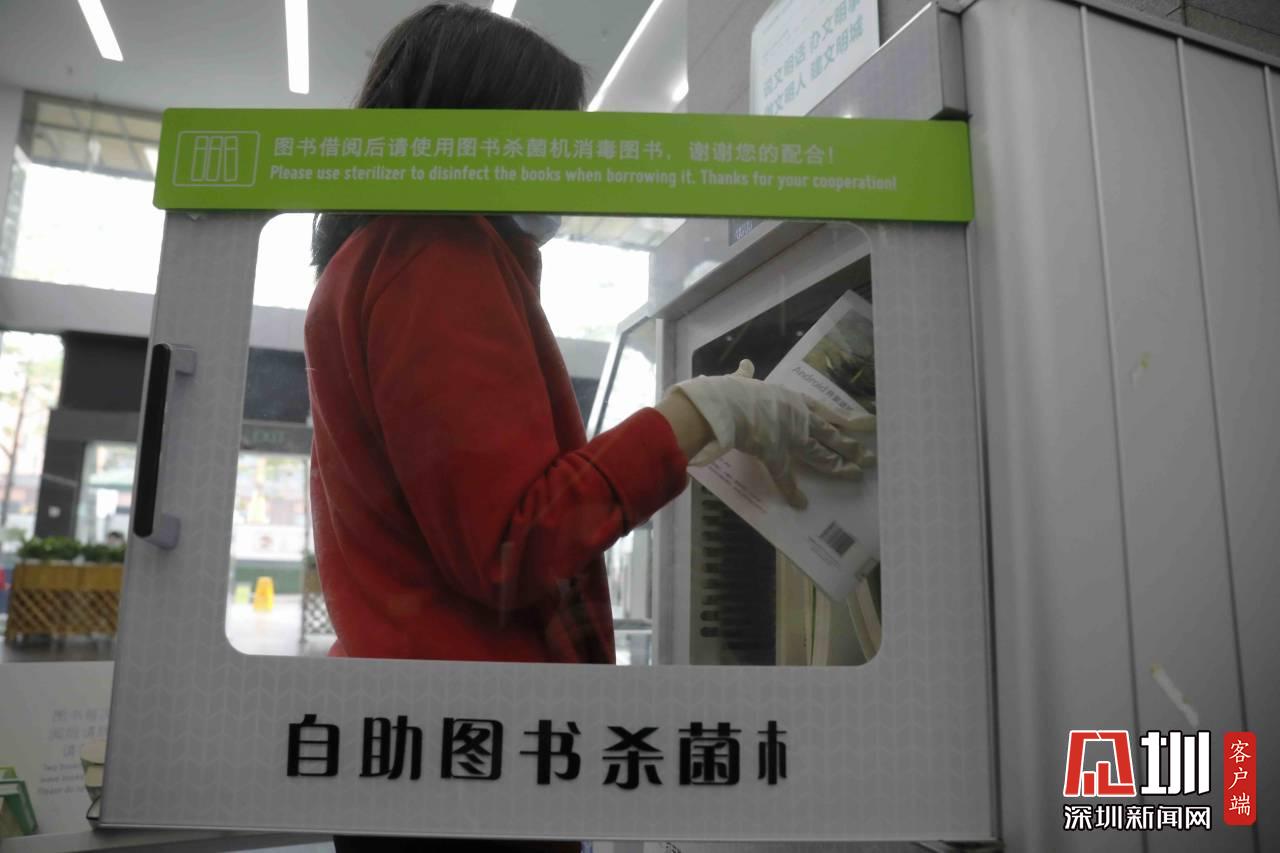 工作人員正在對福田圖書館的書做消毒處理。