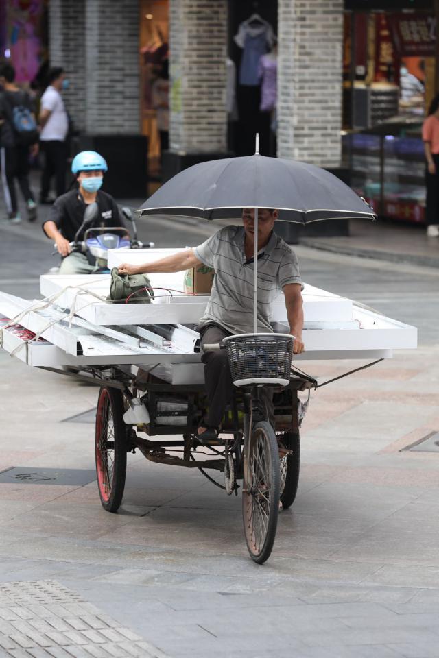 ▲市民在電動車、三輪車上支起防曬傘。