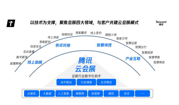 伴隨著云計算、5G、AI、大數據等技術的成熟,騰訊已經成為多個大型會展項目提供產品和技術服務,不斷實踐和探索線上線下融合的產品技術及綜合解決方案。騰訊云會展打造的有別于實體觀展模式的新思路和新玩法,包括線上展覽、智慧展會、云展覽等形式,也正為各級政府和企業激活云上經濟注入新動能。