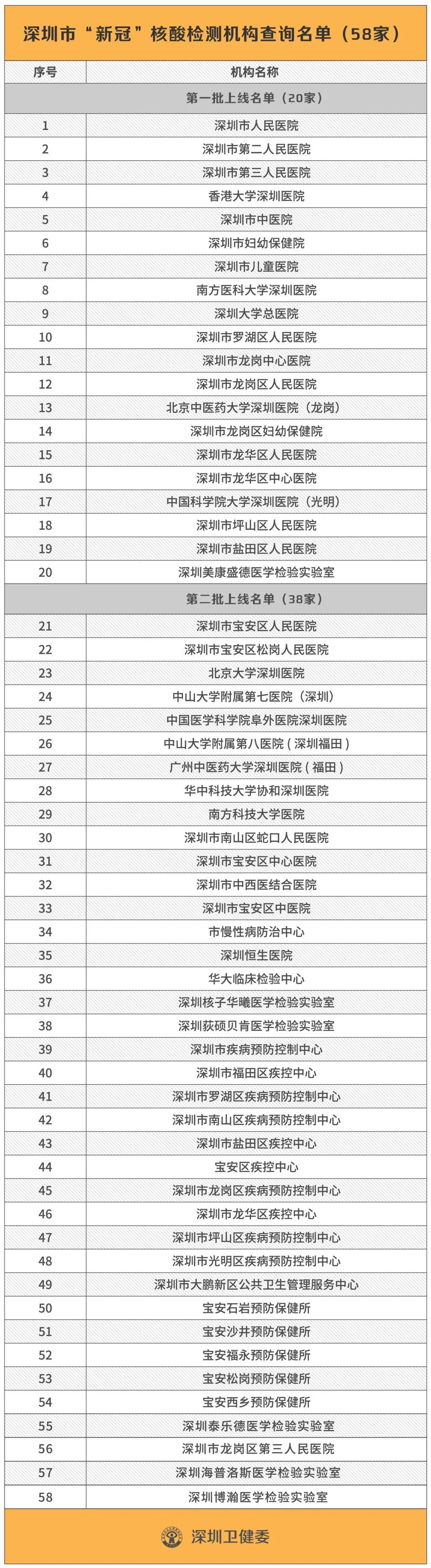 目前,深圳共有58家機構開展新冠病毒核酸檢測,包括35家醫院、16家公共衛生機構和7家第三方檢測機構。