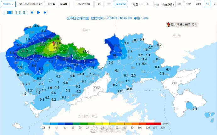 【深圳市分區暴雨黃色預警】預計福田區,羅湖區,南山區,鹽田區,大鵬新區,西部海區,東部海區,寶安區(新安、西鄉、航城街道),龍崗區(南灣、坂田、園山、橫崗、布吉、吉華街道),龍華區(民治街道)和坪山區(馬巒、碧嶺街道)1-2小時內將出現20-40毫米降水,深圳市氣象臺于2020年05月18日15時50分在上述地區發布暴雨黃色分區預警,全市進入暴雨戒備狀態,請注意防范。