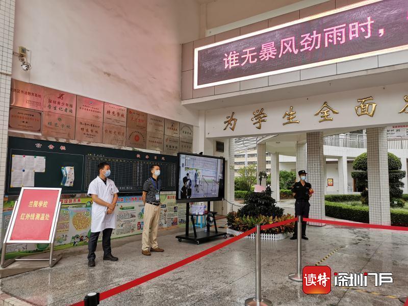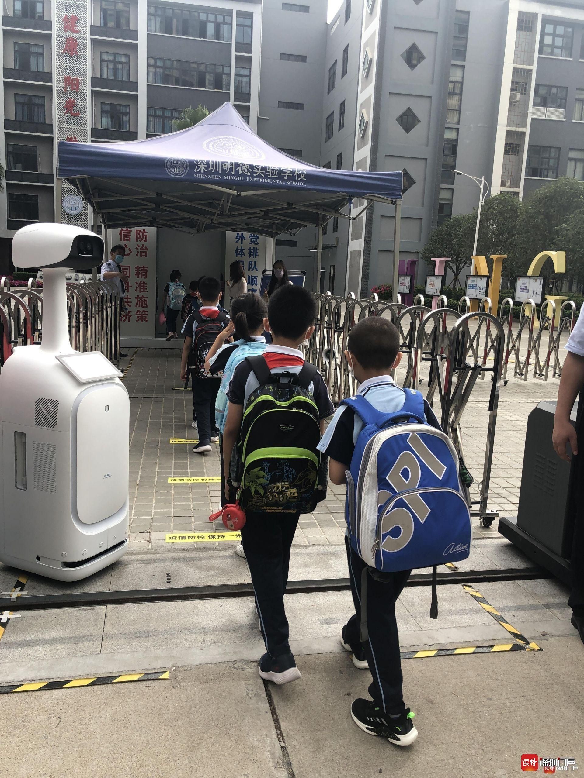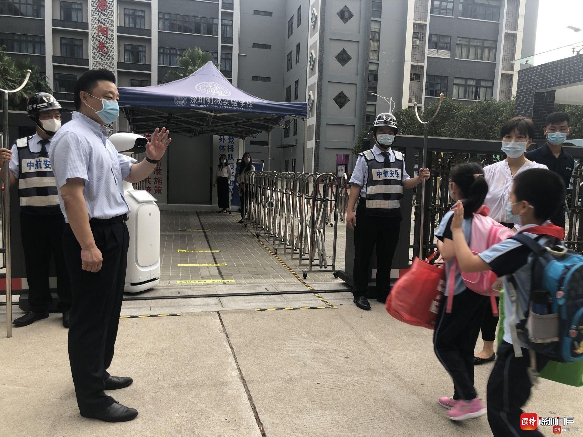 “同學們好!”“歡迎回來!”從7點起,明德實驗學校校長魯江與工作人員就在香蜜校區校門口迎候學生們,提醒孩子們戴好口罩,也與家長們交流返校事宜。校門口的一臺超氧水消殺機器人也在積極投入工作,工作人員在后臺控制面板可以監測到入校人員的體溫情況。