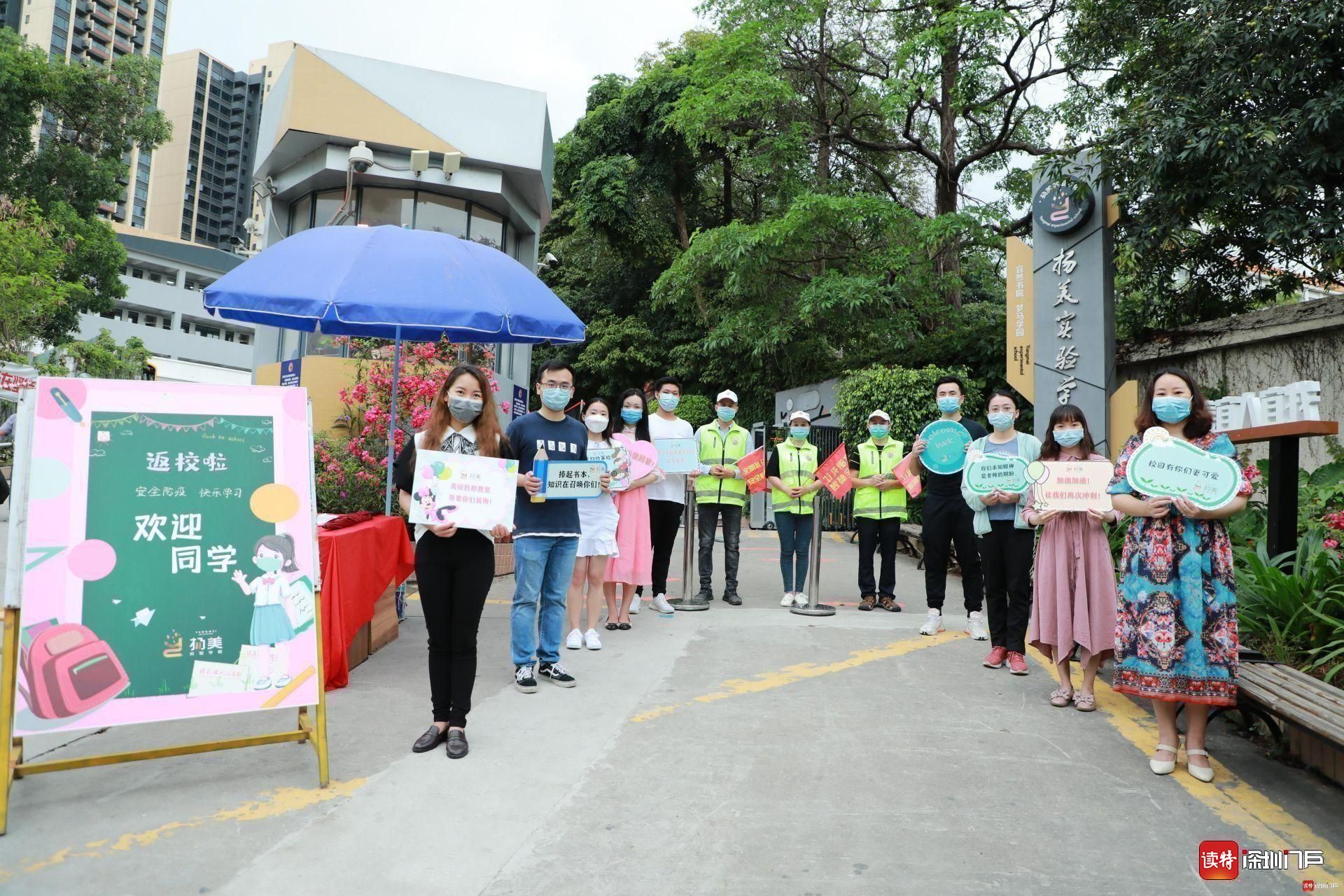 揚美實驗的老師們捧著特制歡迎牌,向返校的孩子們問好。家長義工們身穿綠馬甲、手持小紅旗,在校門附近疏通交通,為孩子們保駕護航。揚美學子佩戴口罩,按照錯峰時間表通過體溫測量儀,有序進入校園。