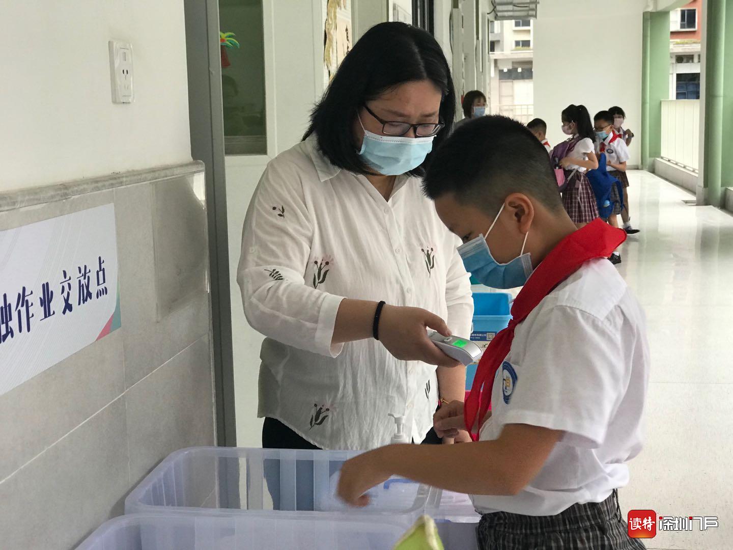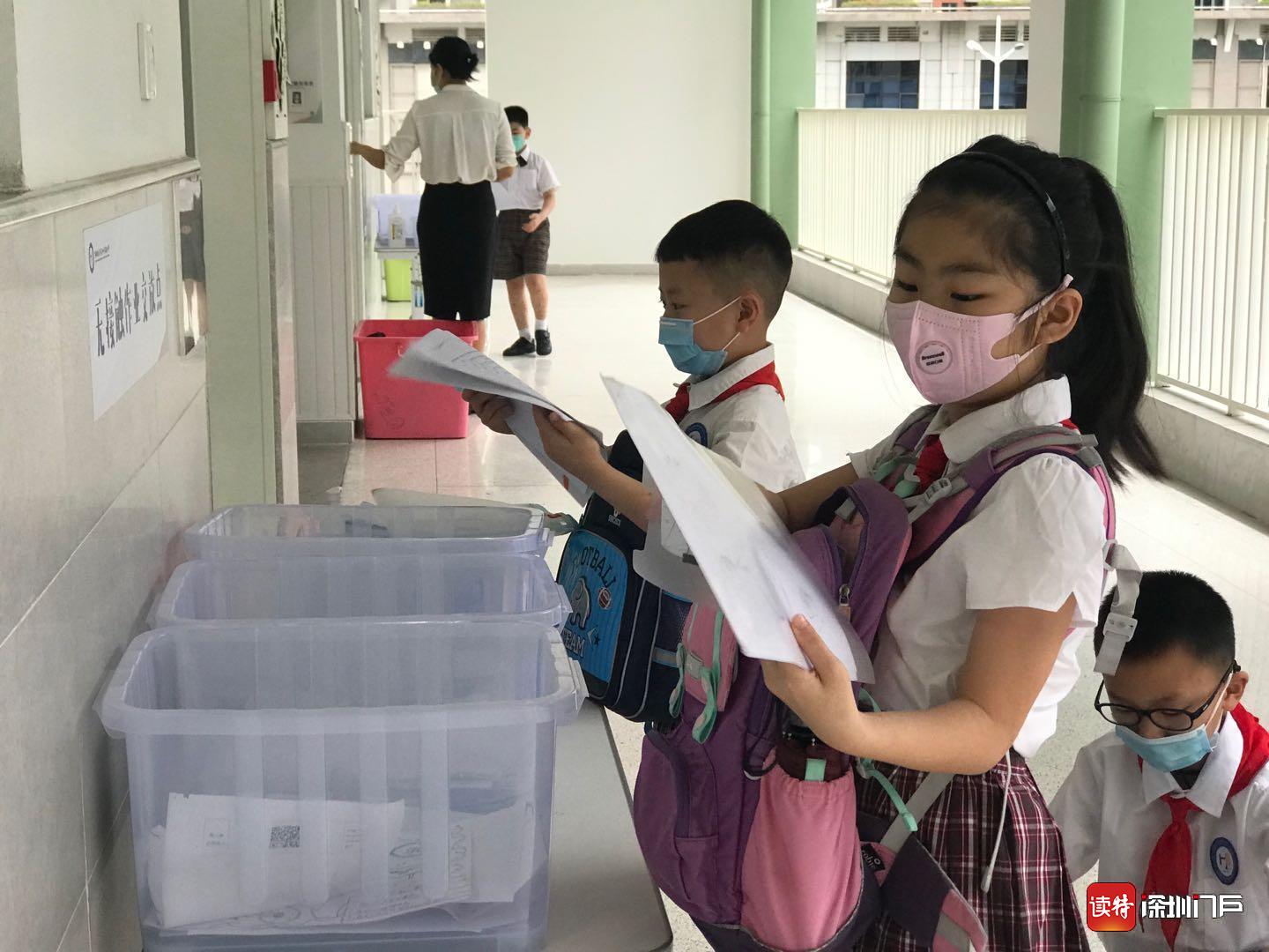 “同學們早上好!”“老師們好!”18日一大早,龍華區和平實驗小學的老師們都早早做好準備,站在學校門口,迎接孩子們歸來。在各班教室門口,學校還貼心的準備了“無接觸作業交站點”,同學們按順序自覺將學科作業放進箱內,減少了不必要的接觸。(讀特記者何亞南)