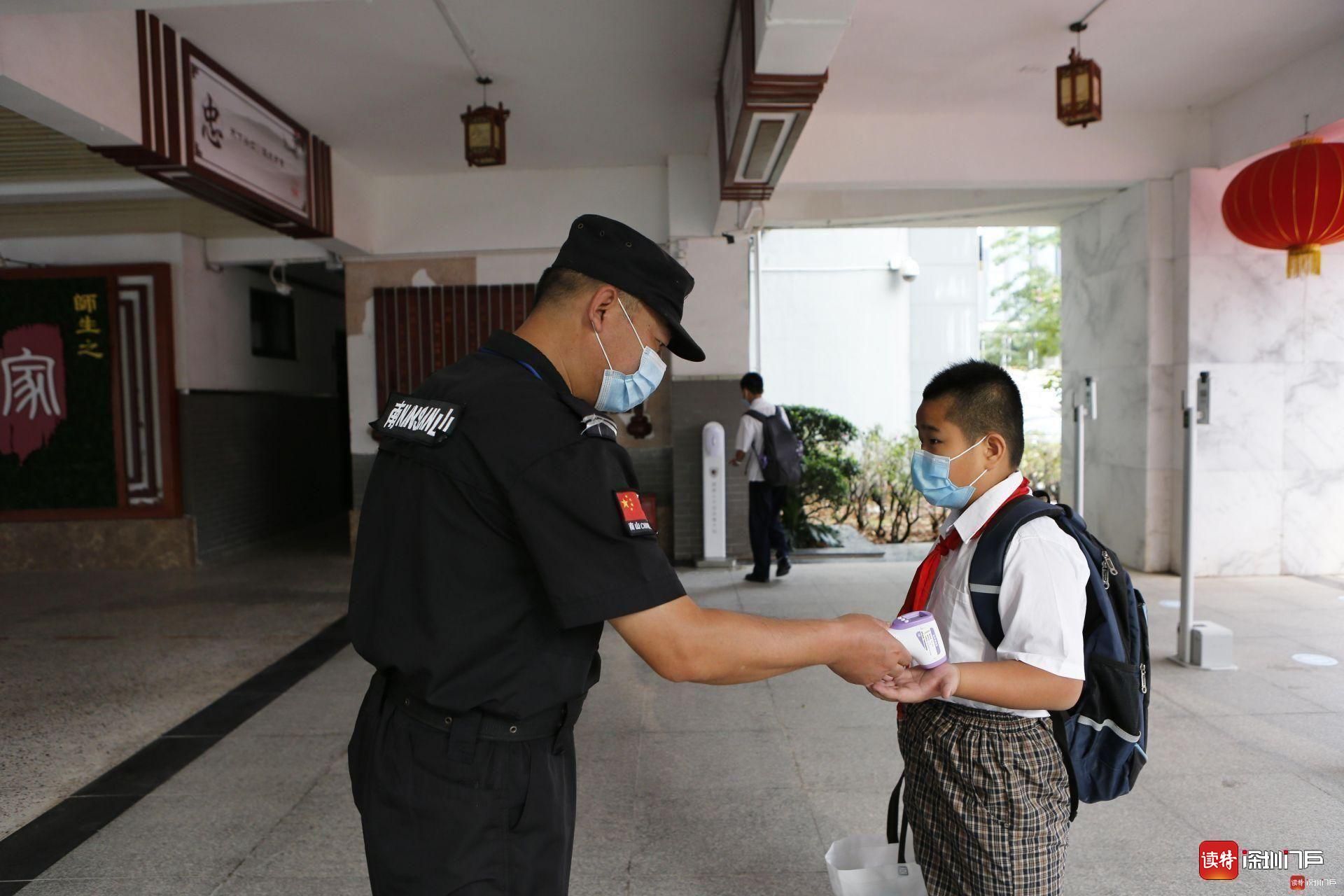 南山區科創學校,安保人員正在為返校的學生測量體溫。