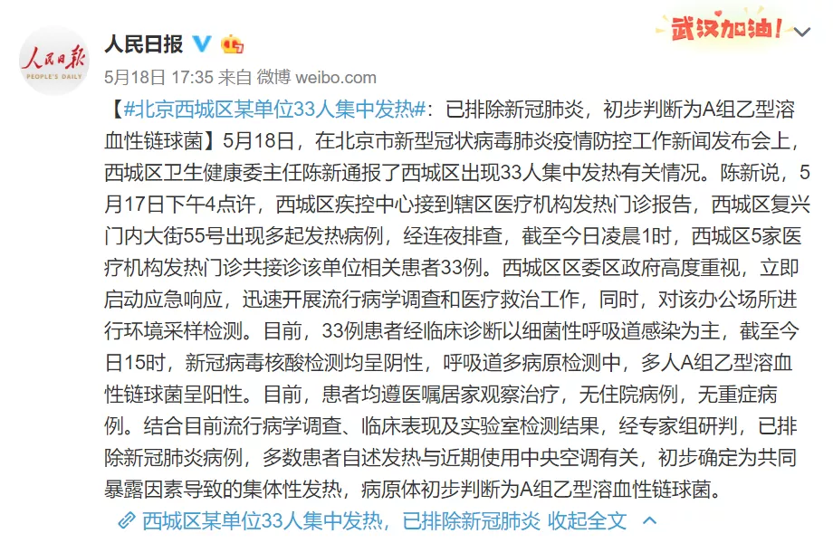 目前,33例患者經臨床診斷以細菌性呼吸道感染為主,截至5月18日15時,新冠病毒核酸檢測均呈陰性,呼吸道多病原檢測中,多人A組乙型溶血性鏈球菌呈陽性。