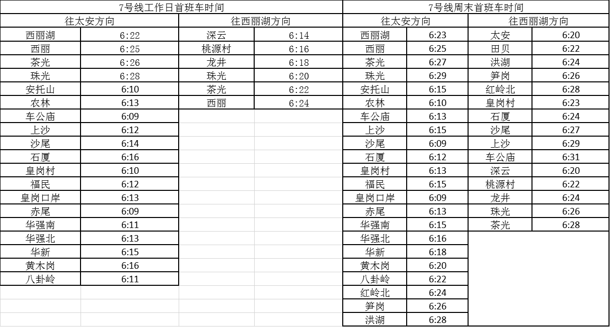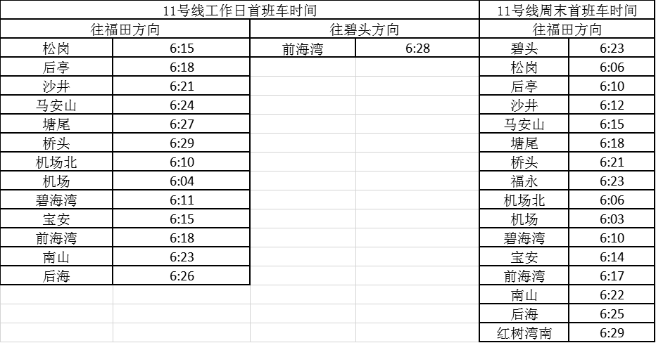 記者獲悉,經優化調整后,各線路工作日首班車最早發車站點及時間分別為,1號線老街站6:29、2號線蛇口港站6:14、3號線塘坑站6:05、5號線坂田站6:01、7號線赤尾6:09、9號線銀湖6:05、11號線機場站6:04。周末期間首班車最早發車站點及時間分別為,2號線香梅北站6:07、3號線塘坑站6:04、5號線長嶺陂站6:00、7號線皇崗口岸站6:09、9號線孖嶺站6:05、11號線機場站6:03。