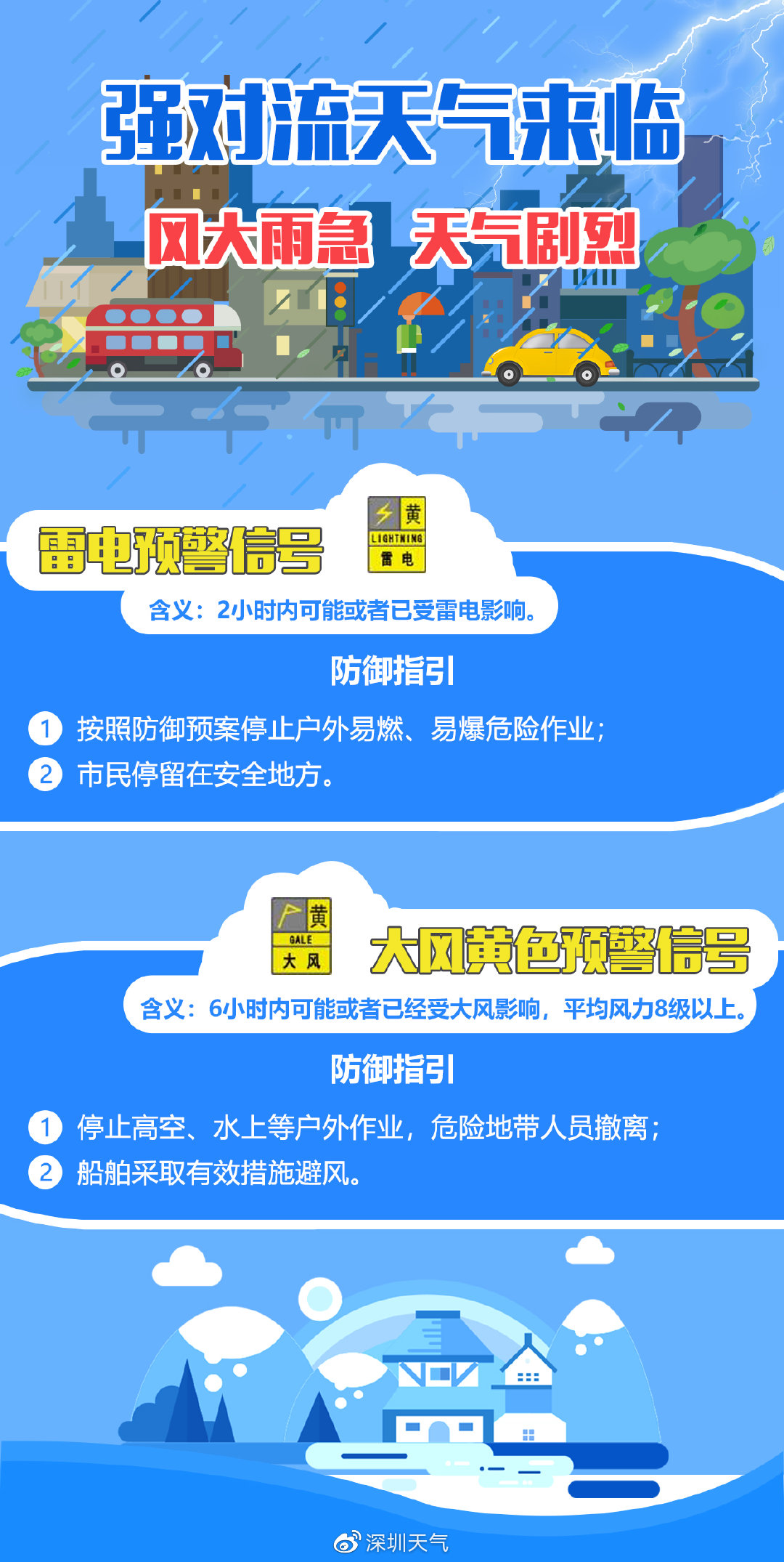 據深圳天氣微博消息,過去1小時,大鵬新區和東部海區累計雨量已達暴雨,預計強降雨還將持續2-3小時,全市進入暴雨防御狀態,請注意防御。中小學、幼兒園可視情況推遲上學。同時暴雨黃色分區、大風黃色、雷電預警正在生效中,請注意做好防御。
