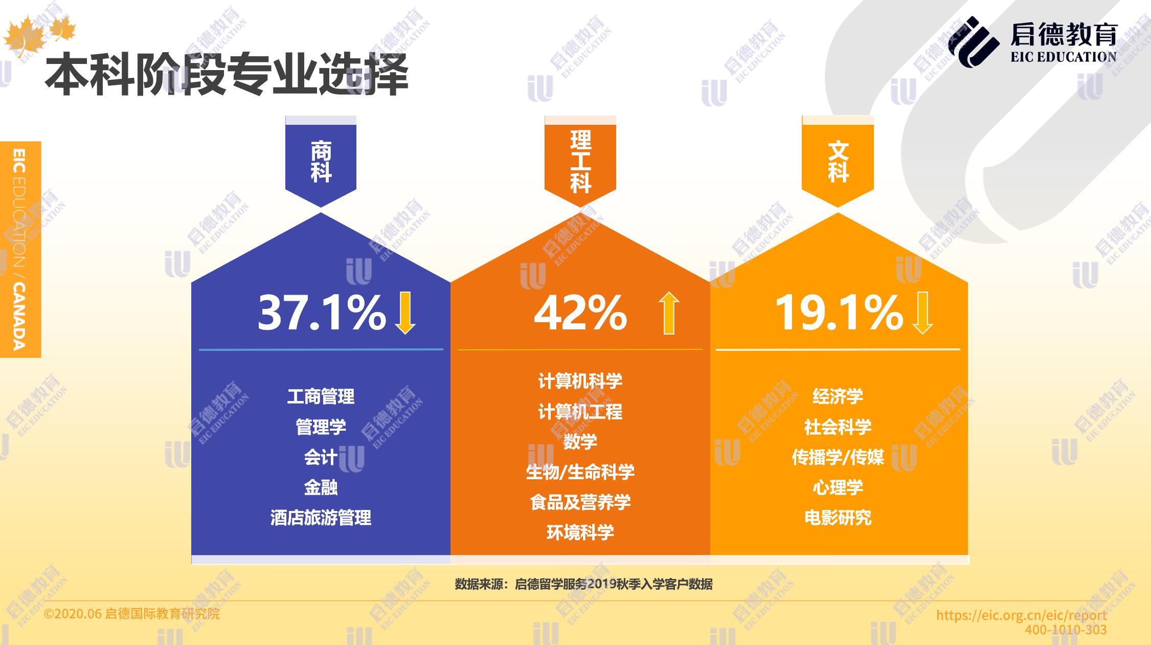 啟德留學服務2019秋季入學客戶數據顯示,在本科階段專業選擇理工科占比42%,商科占比37.1 %,文科19.1%,理工科的申請人數超過了商科。碩士階段選擇最多的專業是 MBA、教育學和計算機,其他新興的跨學科專業包括滑鐵盧大學的數字科學與人工智能碩士,滑鐵盧大學的 MBET (商業、創業和技術專業),與麥克馬斯特大學的 MEEI (工程、創業與創新專業)。