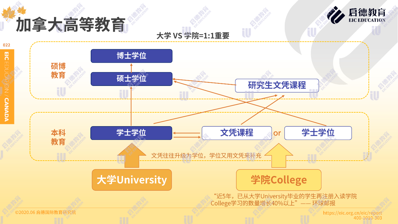按照不同的培養目的,加拿大的大學分為醫博類大學、綜合類大學與基礎類大學。加拿大大學以公立大學為主,本科學制為3至4年。加拿大授課型碩士學習時長通常為一至兩年;研究型碩士學習時長通常為兩年。在加拿大高等教育階段學成畢業后,不限大學和學院,不限學位或文憑課程,不限時長,畢業生均可申請1 -3年的畢業工作許可,根據學習時長,2年以上學時的學歷(文憑、本科、碩士)均可獲得3年工作許可,1年學時的學歷(研究生文憑)可獲得1年工作許可。