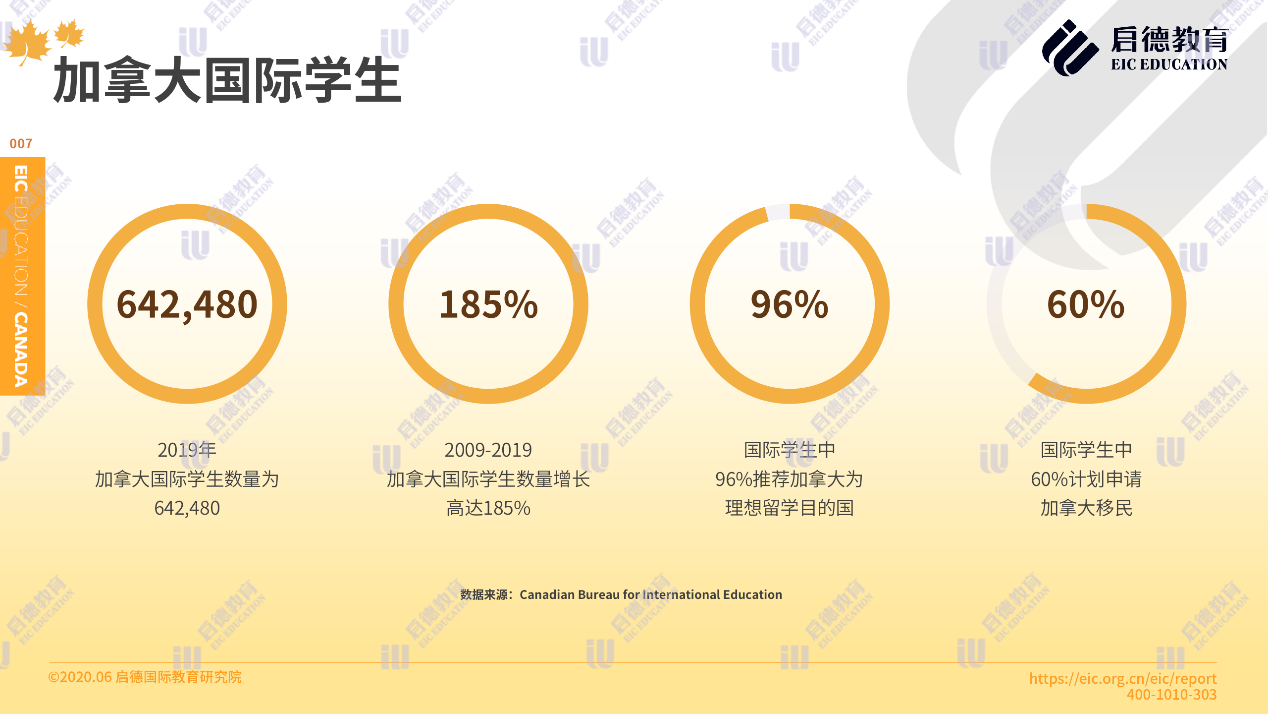 加拿大國際教育局( Canadian Bureau for International Education )數據顯示,2019年加拿大國際學生數量為642480人,2009-2019加拿大國際學生數量增長率達到185%。加拿大統計局數據顯示,截至2019年12月31日,加拿大留學生人數最多的三個省為安大略省(306,735 )、英屬哥倫比亞省(144,675 )、魁北克省(87,280 ),增長率相比2018年分