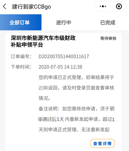 客戶完成補貼申請提交后,平臺將進行首次初審,初審結果將于近期返回并通過短信方式告知客戶。屆時,客戶可通過登錄“建行到家CCBgo-我的-我的申請”查看審核進展。