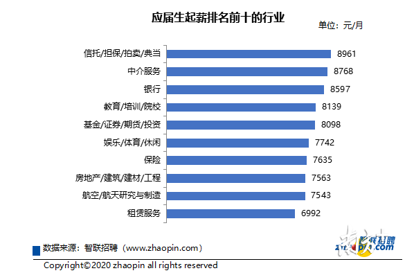 報告顯示,應屆生起薪排名前十的行業中,信托/擔保/拍賣/典當、中介服務、銀行等行業為起薪排名前三名,分別為8961元,8768元和8597元。除此之外,教育/培訓/院校、娛樂/體育/休閑等受益于直播經濟的帶動和數字化的發展,也向應屆生開出了相對高的薪酬。