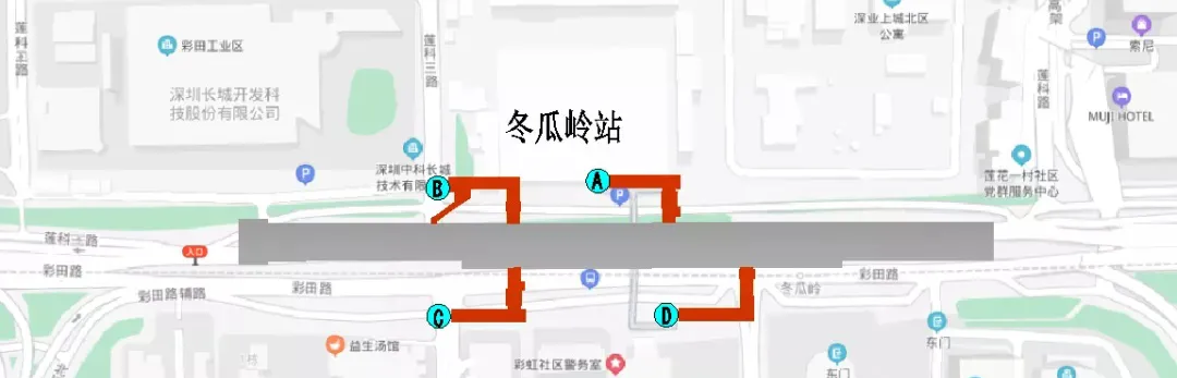 其中,A、B出入口近現代電子地塊;C出入口靠近彩虹閣住宅地塊;D出入口靠近長城盛世家園地塊;物業E出入口靠近深業上城地塊;物業F出入口靠近中級法院地塊;物業G出入口靠近天威視訊地塊。其中,物業E、F、G出入口正在建設中。