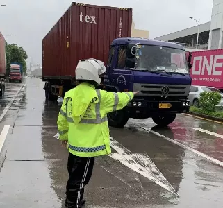 8月5日9時30分許,深圳交警鐵騎隊員雨中巡邏至新沙路時,發現德昌電機廠路段有一輛貨車停在路上,導致交通擁堵。貨車司機在旁,鐵騎上前詢問情況后得知貨車故障,司機被迫將車停在路邊。