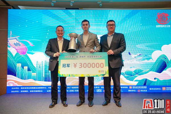 王志強與麥帆為王天一頒發今年“鵬城杯”獎杯以及30萬元的冠軍獎金。王天一表示,“鵬城杯”是國內平均水平最高的賽事,經過兩年成功辦賽,現在影響力越來越大,受到廣大棋手們和社會各方的重視,感謝深圳市文化廣電旅游體育局與佳兆業的鼎力支持。而“鵬城杯”也讓他在2020年末實現了一個小目標,今年唯一的一個個人賽冠軍,也實現了每年都能獲得一個冠軍的愿望。